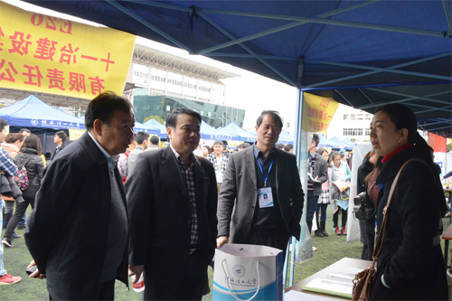 梁福沛副校长、广西高校毕业生就业指导中心主任蒋瀚洲(左二)一同与招聘企业负责人交流