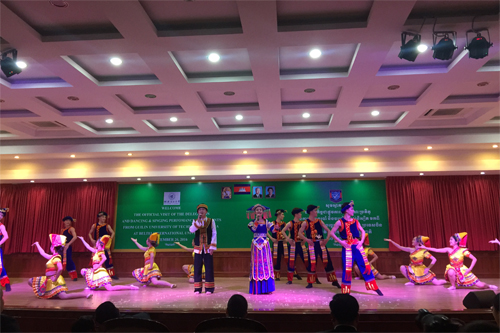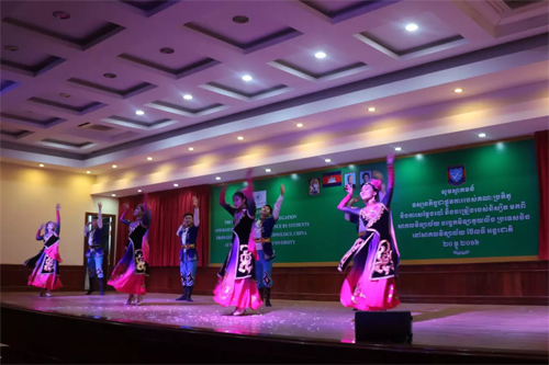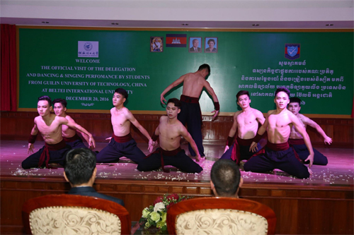 次日下午,交流团一行来到柬埔寨贝尔太国际大学,该校校长LY Chheng、副校长LY Navuth对同学们的到来表示热烈的欢迎。在随后的文化交流中,中柬同学一起为在场师生献上了一场精彩演出。beat365学子表演了极具中华传统和民族特色的苗族舞蹈《红苗伞》、琵琶独奏《春江花月夜》、新疆舞《掀起你的盖头来》、广西民歌《藤缠树》;由beat365越南、柬埔寨留学生共同表演的中国国粹---川剧变脸将演出推向高潮。最后,全场师生一起走上舞台,共同演绎壮族歌舞《大地飞歌》,为柬埔寨交流演出画上了完美句号。