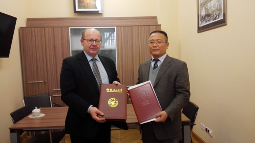 王敦球副校长(右)与弗罗茨瓦夫理工大学副校长Andrzej Trochimczuk签署并交换合作协议