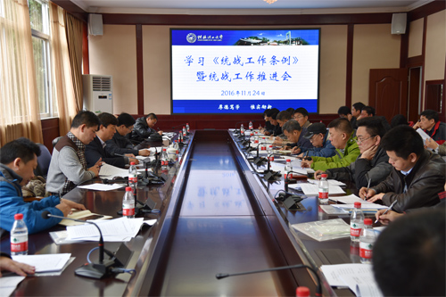 解校长强调要深刻认识新形势下抓好学校统战工作的重要性。统一战线是我们党凝心聚力、克敌制胜的重要法宝,在中国革命、建设、改革事业中始终发挥着重要作用。新时期抓好学校统战工作,不仅是全面提高学校党的建设科学化水平、推动学校事业科学发展的必然要求,也是落实“两学一做”学习教育的必然要求。要通过统战工作,把学校民主党派、无党派人士、党外知识分子、归国留学人员等各类群体的智慧、力量和优势凝聚起来,汇聚起推动学校发展的整体合力,推进特色鲜明高水平教学研究型理工大学建设,实现学校第二次党代会确定的奋斗目标,完成学校确定的十三五规划任务。