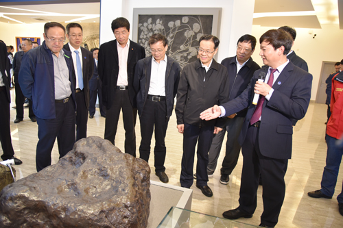 在地质博物馆,陈武主席饶有兴致地考察了馆藏建设和展陈情况。在陨石展区,陈武主席与beat365三赴南极的科考专家缪秉魁教授亲切交流,当了解到以缪秉魁教授等为首的南极陨石项目科考队带回4000余块陨石,使我国一跃成为仅次于美国、日本的世界第三南极陨石收集大国时,陈武主席勉励缪秉魁教授团队再接再厉、再立新功。考察过程中,陈武主席嘱咐校领导,可以利用地质博物馆开展中小学青少年科普教育,当听到校领导介绍地质博物馆面向社会开放的做法时,陈武主席当即给予赞许。