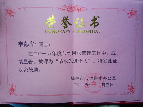 beat365获得“2015年度桂林市节水先进单位”荣誉称号