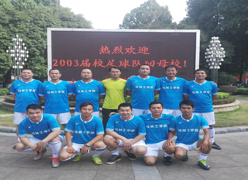 10月22日,周末的校园迎来了一批特殊的校友。他们中有管理精英、民企老总还有科技先锋,但是他们都有一个共同的身份——学校足球队老队员。13年前,他们怀着共同的爱好和梦想相识于绿茵场,通过刻苦训练,团结拼搏,取得了广西大运会足球比赛冠军等诸多佳绩,谱写了学校足球运动发展的辉煌篇章。13年后,10多名队员和教练员再次相聚在母校,共叙绿茵情、同学情、母校情。 10月22日下午四点,2003届校队和现在的校队足球友谊赛在屏风校区足球场举行。2003届校队的队员们风采依旧,排兵布阵、接球、传球有板有眼、尽显风采。双方秉持友谊第一的原则,在球场上激烈拼搏,交流互动,最终以2:2的比分握手言和,圆满完成了比赛。 校友们还参观了体育教学部荣誉室。他们仔细聆听昔日教练介绍学校体育工作这十几年发展历程,特别关注校足球队获得了2014-2015特步杯-中国大学生校园足球联赛广西赛区冠军,并代表广西参加全国分区赛。校友们纷纷表示完成了他们没有完成的心愿,冲出广西走向全国!校友们又驻足在他们那届大运会冠军奖杯前,大家共同回忆了美好的大学生活,同时为母校的发展变化倍感振奋和自豪。