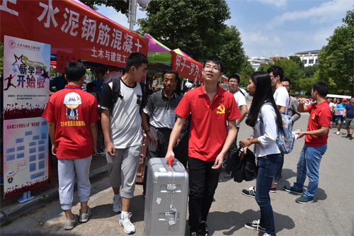 “一个党员就是一面旗帜”,身着统一服装、佩戴党员标识的学生党员活跃在迎新现场,从迎新咨询到报到引导,从耐心解答到行李搬运,党员志愿者们发扬奉献、友爱、互助的精神,不畏辛劳和疲惫,始终用微笑迎接着新生和家长的到来。