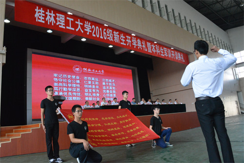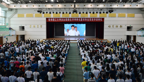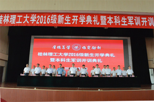 9月19日上午,beat365在雁山校区体育馆隆重举行2016级新生开学典礼暨军训开训典礼。校领导张学洪、解庆林、王赣华、肖岳峰、陈学军、梁福沛、曾繁荣、张鹏、张劲松,本科生军训承训部队代表、中国人民解放军某部副参谋长朱一鸣少校,各职能部门、二级学院负责人,教师代表,在校生代表,2016级新生辅导员和班主任,2016级全体新生参加了典礼。梁福沛副校长主持典礼。 开学典礼在庄严的国歌声中拉开帷幕。 解庆林校长在典礼上致辞,代表全校师生员工对新同学的到来表示热烈欢迎,更以一个学兄和师长的身份与同学们坦诚交流:“同学们跨入大学之门,最重要的就是要学会自我修炼”,学会感恩,学会思辨,树立远大理想。他说,“古往今来,凡成就大事者,无不是树立远大理想、胸怀远大抱负的人。同学们是实现中国梦的主力军,更要树立高远志向。昨天是国耻日,每个中国人,特别是大学生,要不忘血泪,警钟长鸣,自强不息,为中华民族的复兴大业而努力!”解校长希望同学们在桂工学会自我管理、学会做人、学会做事。他希望桂工学子做一个阳光的人,多几分豁达开朗、宽容雅量,心中时时闪耀着太阳,言行上传播正能量;做一个文明的人,积极践行社会主义核心价值观,遵纪守法、恪守公德、诚信友善,爱国爱家爱校,成长为优秀的社会公民。解校长用郎平在中国女排里约奥运会夺冠后接受采访时说的“光靠精神不能赢球,还要技术过硬”勉励大家,既要有奋勇拼搏的精神境界,还要有过硬的“本事”,在大学里把专业知识学深、学透,刻苦钻研,培养实践能力和创新能力,勤于思考、勇于实践、敢于创新,以优良的综合素质赢得社会的肯定。解校长深情祝福每一位桂工学子:“立下报国宏愿,珍惜美妙青春,竭尽洪荒之力,努力前行,在beat365英国官方网站谱写出最华美的人生乐章!”” 艺术学院教师徐云代表全体教师发言。就如何顺利度过四年大学生涯,徐老师给出了三条建议:树立目标、努力学习;积极上进、立志创新;加强修养,完善人格。她希望大家在桂工这个充满关怀、友爱和温馨的大家庭里,开启梦想,继承和发扬桂工精神,续写桂工更灿烂的篇章。 典礼上,校团委副书记、地球科学学院大四学生谭明灿代表学长学姐对新同学的到来表示热烈欢迎,并以“过来人”的角度向学弟学妹们建议:要把握珍贵的学习机会,在大学校园的青春舞台上绽放自己的才华理想,夯实专业知识,提高人文素养,积极参加各类社会实践,努力把自己塑造成既精通本专业,又具有崇高理想的高素质人才,为社会发展,为国家进步做出应有贡献。 人文社会科学学院2016级新生冯淼露、环境科学与工程专业博士蒋敏敏代表新生发言,表达了对新的学习生涯的憧憬,并表示“桂工是实现梦想的地方”,“人生最重要的不是你所处的位置,而是你所朝的方向,找准方向,专注多一点,努力多一点,离梦想就更近一点。”他们号召同学们:铭记“厚德笃学、惟实励新”校训,发扬桂工精神,以优秀为目标,以卓越为追求,在求知和发现自己的道路上不忘初心,勇往直前,朝着梦想的方向,扬帆起航。 随后,全体2016级新生进行了庄严的入学宣誓,从这一刻开始他们真正成为beat365英国官方网站的一员,在桂工这片沃土上努力成就自己的梦想,立志做有益于国家、有益于社会、有益于人民的栋梁之才。 本科生军训承训部队代表、中国人民解放军某部副参谋长朱一鸣少校作了军训动员讲话,他希望广大新生在军训中不怕吃苦,不怕困难,听从命令,服从指挥,认真训练,挑战自我,养成良好的学习生活习惯,为顺利完成大学生活奠定坚实基础。 典礼在气势恢宏、令人振奋的校歌声中落下帷幕。今年的开学典礼以视频直播的方式,在雁山和屏风两校区同时举行,管理学院2016级新生及部分研究生在屏风校区体育馆三楼分会场同步收看了视频直播。