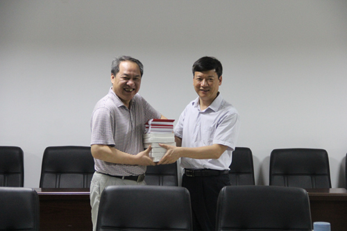 解庆林校长(右)向分校党委赠送学习资料