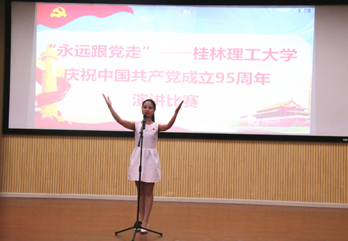 为庆祝中国共产党成立95周年,推动“两学一做”学习教育及“感恩教育”主题活动深入开展,加深大学生对党的了解和认识,进一步增进大学生对党、对祖国、对人民的热爱之情,5月10日晚,学校党委在雁山校区图书馆报告厅组织举办了“永远跟党走”---庆祝中国共产党成立95周年演讲比赛。学校党委常委、副校长梁福沛出席比赛活动并为获奖选手颁奖。党委组织部、宣传部、学工部、研工部、团委等部门负责人和各二级学院师生代表参加了本次活动。