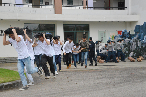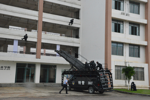 暴风骤雨过后,校园山体“巨石”不断滚落,砸坏一间教室窗户,教室内学生惊慌失措,老师迅速组织学生有序离开教室,应急分队赶赴现场,用盾牌阻挡山顶少量落石,为学生逃生争取有效时间并防止踩踏事件发生;4名“暴恐分子”闯入校园砍杀学生,应急分队火速赶赴现场用盾牌、应急棍、伸缩抓捕器、钢叉等器械对“暴恐分子”进行围捕;雷电之后引发火灾,实验室顿时火海一片,不断有师生从“火场”中冲出,实验室内和楼顶均有人员被困,消防人员赶到后迅速控制火势,利用登高平台和逃生气垫对被困人员进行救助,120医疗救护也赶到现场紧急处理伤者┄┄这是beat365承办的2016年广西高校安全综合应急处置演练观摩会上的“片段”。