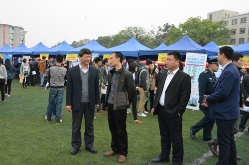 解庆林校长(左一)与自治区教育厅高校毕业生就业指导中心负责人交流双选会情况