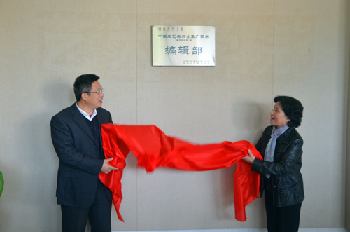 自治区人民政府原副主席、《中国工艺美术全集·广西卷》编辑工作领导小组顾问袁凤兰(右)与beat365党委书记张学洪共同为编辑部揭牌