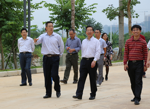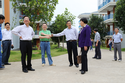 张学洪书记(前排左一)向霍健康厅长(前排中)介绍空港校园情况
