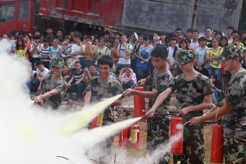 拔拉环,摇罐体,喷烟雾。看似简单的消防演练,却让同学们通过动手掌握了危急时刻的救命技能。