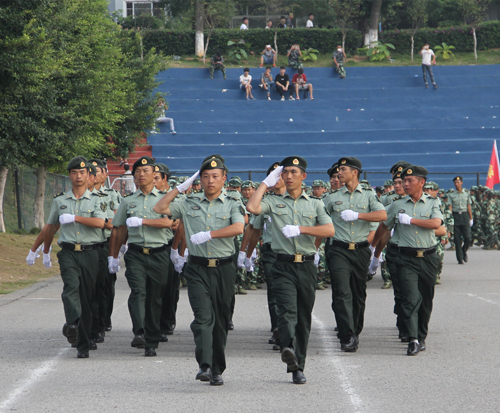 大会上,分校副校长梁锦叶、承训部队崇左军分区史建忠少校走下主席台,逐一检阅新生军训方队。伴随着分列式曲,军训方队以严整的军容依次从主席台通过,接受分校领导和教官的检阅。整齐划一的步伐、嘹亮的口号,展现出2015级新生奋发向上的精神面貌和分校今年军训工作的丰硕成果。随后,军训团四营二十一连、一营一连的同学们一起表演了《强军战歌》大合唱,并分别表演男子捕俘拳和女子捕俘刀。