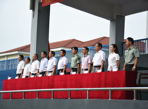 9月17日上午,南宁分校2015级新生军训开训动员大会在空港校区运动场隆重举行。学校校长助理、分校校长王文,承训部队崇左军分区史建忠少校,分校党委书记罗雪平,分校党委副书记梁冬松、黄润均,学校纪检监察室副主任迟国东,分校副校长劳景寮、陈东莲、梁锦叶、唐承泽等领导出席大会并在主席台就座。分校部分职能部门负责人,各系党总支书记、副书记,2015级新生班辅导员以及全体新生参加了动员大会。大会由分校保卫工作部主任陈发杰主持。