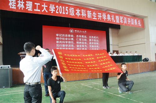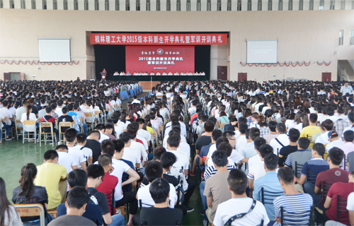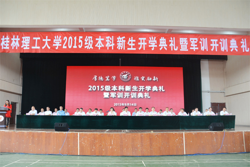 9月14日上午,学校在雁山体育馆隆重举行2015级本科新生开学典礼暨军训开训典礼。在家校领导学校校长解庆林,党委副书记王赣华,党委副书记、纪委书记陈贵英,副校长周国清、王敦球,正厅级调研员张鹏,副厅级调研员张劲松,承训部队代表、中国人民解放军某部政治处主任李明少校,2015级全体本科新生,学校相关职能部门和各学院负责人,教师代表,老生代表以及2015级本科生辅导员和班主任参加了典礼。典礼由陈贵英副书记主持。 典礼在庄严的国歌中拉开序幕。学校校长解庆林教授在典礼上作了热情洋溢的讲话。他首先代表学校全体师生员工向2015级新同学的到来表示热烈欢迎!随后向2015级新同学介绍了学校的辉煌历史、优良的办学传统和丰富的教学优势及特色。解校长引用去年习近平总书记在北京大学座谈会时 “扣扣子”的比喻告诫大家:“青春处在价值观形成和确立的时期,抓好这一时期正确价值观的养成十分重要。这就像穿衣服扣扣子一样,如果第一粒扣子扣错了,剩余的扣子都会扣错。人生的扣子从一开始就要扣好。”就如何开启大学生活,解校长向全体新生提出四点希望:一是希望同学们“明志”,明确目标,让梦想成为人生动力。二是希望同学们“修身”,锤炼品德,让德行成为人生追求。三是希望同学们“勤学”,勤于学习,让学习成为人生习惯。四是希望同学们“惜时”,珍惜时光,让惜时成为人生态度。对即将开启的军训生活,解校长指出,军训是beat365按照教育部等上级部门规定要求确定的必修课程,希望同学们严格按照教官的要求认真完成好各项训练任务,继承解放军“一切行动听指挥”的优良传统,加强纪律性组织性;通过军训锻炼健康体魄,为更好地完成大学阶段学习任务打下良好基础。最后,解校长衷心地祝愿2015级新同学在beat365英国官方网站谱写一曲美丽的青春之歌,成就自己别样精彩的快乐人生! 中国人民解放军某部政治处主任李明少校代表承训部队在军训开训典礼上作了动员讲话。教师代表、地球科学学院时毓老师,在校生代表、校学生会主席钟广龙,新生代表、管理学院王洋同学先后在典礼上发言。 随后,全体2015级4347名本科新生进行了庄严的入学宣誓,从这一刻开始2015级本科生真正成为beat365英国官方网站的一员,他们将在桂工这片沃土上成就自己的梦想,立志做有益于国家、有益于社会、有益于人民的栋梁之才。 最后,典礼在气势恢宏、令人振奋的校歌声中落下帷幕。