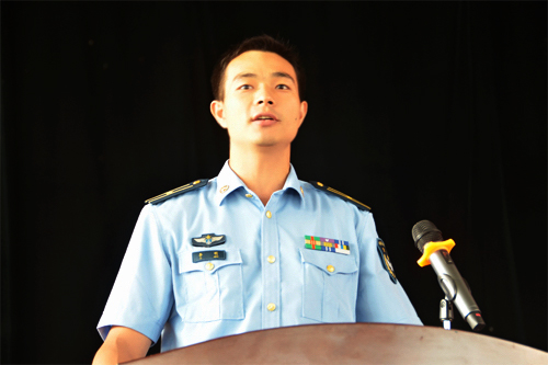 中国人民解放军某部政治处主任李明少校代表承训部队作军训动员讲话