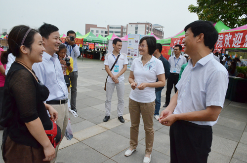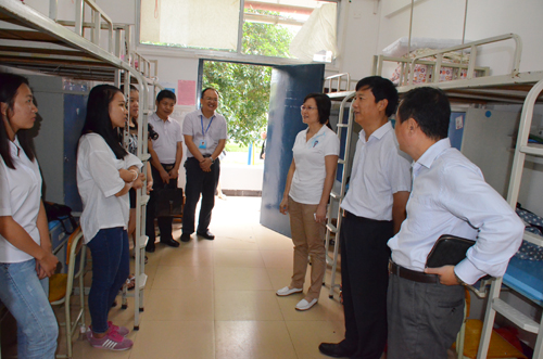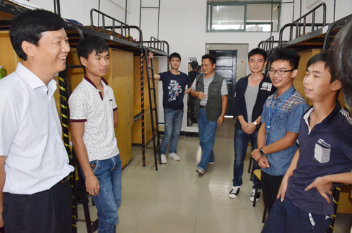 9月13日,学校校长解庆林、副书记陈贵英、副厅级调研员张劲松等校领导一行分别到到雁山校区各学院迎新大本营、绿色通道及财务缴费等地点检查指导迎新工作。在艺术学院迎新点,解庆林校长饶有兴趣地观看了学生的作品展示。在化生学院迎新点,来自来宾报到新生黄莹莹同学很“荣幸”地与解庆林校长一起在入学纪念墙前合影,留下了其一生难忘的回忆。“这个决心很好!”,在地学院新生寄语墙前,解庆林校长指着一名新生“绝不挂科”的留言说道。在环境学院迎新点,解庆林校长看到自己所带班级的学生纷纷来做志愿者很是高兴,他说,作为班主任,我只完成了“规定动作”,“自选动作”做得还不够!在土建学院迎新点,解庆林校长与来自浙江的新生家长攀谈,了解报到情况,希望他们对学校多提宝贵意见和建议。“校园很大,很漂亮!”新生家长说道。在绿色通道办理处,解庆林校长详细地询问了绿色通道办理情况,要求工作人员认真做好此项工作。在旅游学院女生宿舍和艺术学院女生宿舍,解庆林校长热情询问了新生的报到、住宿情况,详细了解了他们对学校的意见和建议,并叮嘱来自山东、山西新生及家长应对桂林“南风天”的注意事项。在机控学院男生宿舍,解庆林校长了解到负责“导学、导管、导助“的学长是一位科技“学霸”后,勉励他发挥自身优势,做好新生的服务与管理工作。