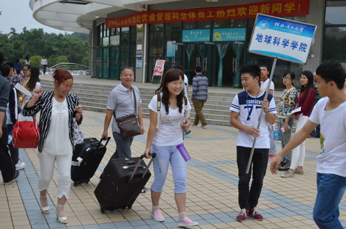 迎新还未开始,各大学院的迎新大本营都早早在图书馆前设点接待新生。各学院也以最醒目的标语吸引新生的眼球,化生学院的帮新生拍入学第一张照片为新生留下了美好的瞬间;旅游学院、管理学院佩戴的党员服务绶带鲜艳夺目;土建学院提倡新生独立注册,给新生们一个独立行动的机会;测绘学院通过签名板签名可以抽取学院为新生精心准备的小礼品,减少新生们的陌生感,拉近与新生的距离;人文社会科学学院更是“有声有色”,运用电视介绍本学院的特色,让新生和家长们更加深入地了解本学院的特点。艺术学院的迎新设点显露着艺术气息,将艺术作品展示在迎新设点前供新生及家长们观赏。