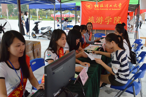 在9月12日、13日的校园里,五彩缤纷的迎新帐篷,热情洋溢、各有特色的迎新标语,五湖四海的2015级新生,以及忙碌地穿梭于其中的工作人员和志愿者共同组成了桂工校园里最美的风景。