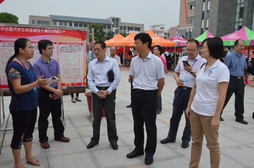 解庆林校长(前右二)、陈贵英副书记(前右一)、副厅级调研员张劲松(左三)等在学院迎新点检查指导迎新工作