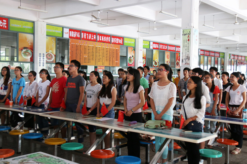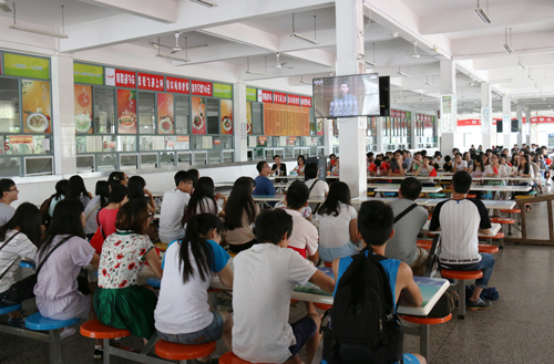 按照学校统一部署,学校开放了各校区餐厅和科技综合楼彩色电子屏供同学们及时收看。在雁山校区、屏风校区,空港校区,不到九点钟,师生们都集中到活动中心、学术报告厅、多媒体教室、科技楼、餐厅、宿舍,认真观看阅兵盛况。