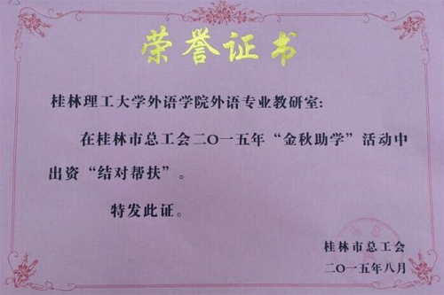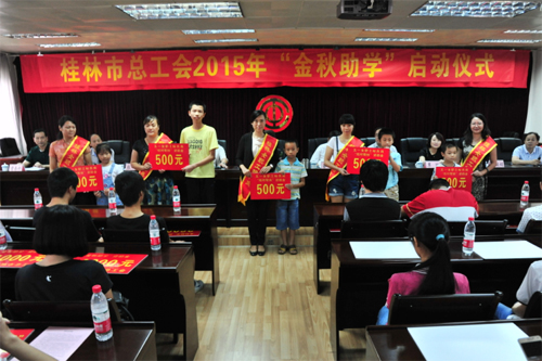 8月26日上午,桂林市总工会举行了2015年“金秋助学”活动启动仪式。beat365工会女工委负责人和五一巾帼标兵岗代表魏彩春、张艳琼参加了本次金秋助学活动。