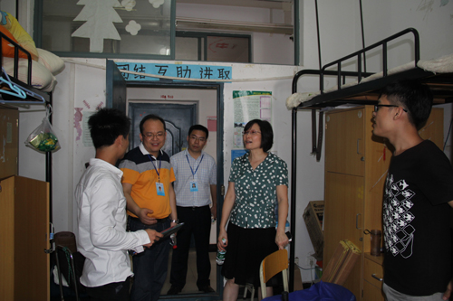 为深入了解2015届毕业生离校工作,6月24日,学校党委副书记、纪委书记陈贵英在学工处、团委和后勤处相关负责人的陪同下,深入雁山校区毕业生离校工作一线检查毕业生离校工作。