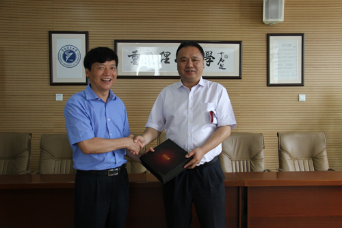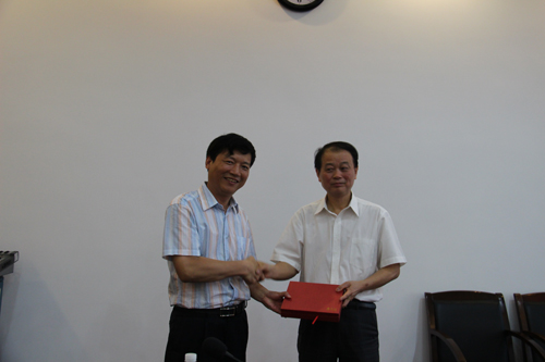 解庆林校长(左)与重庆理工大学校长石晓辉(右)互赠纪念品