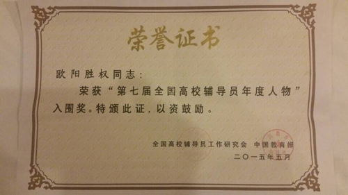 日前,“第七届全国高校辅导员年度人物”入围人选名单揭晓,beat365管理学院欧阳胜权老师荣获“第七届全国高校辅导员年度人物”入围奖。