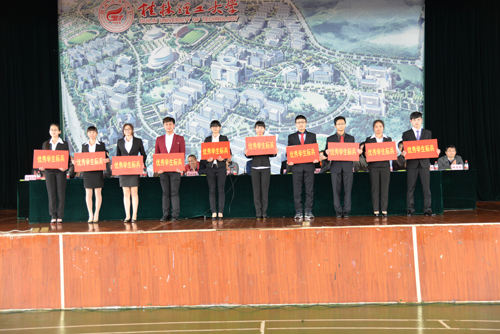 表彰大会在雄壮的国歌声中拉开了帷幕,全体起立奏唱国歌。梁福沛副校长宣读了《2013—2014学年度国家级、自治区级、校级学生先进集体、先进个人表彰决定》,在主席台前排就座的领导为2013—2014学年度学生先进集体和先进个人代表颁奖。