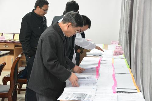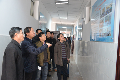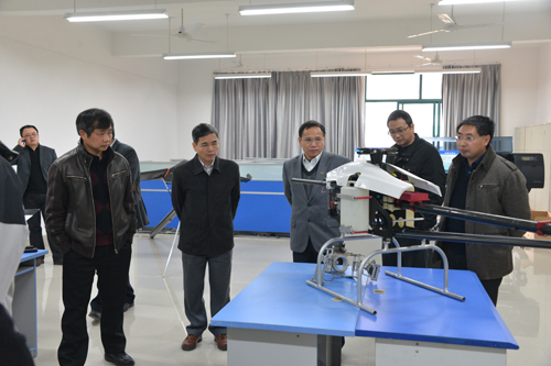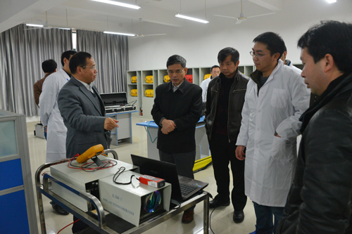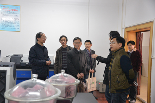 考察组陈保善组长(左二)、科技厅基础处张士军副处长(右二)一行在陈学军副校长(左)、周国清副校长(右三)陪同下检查实验室