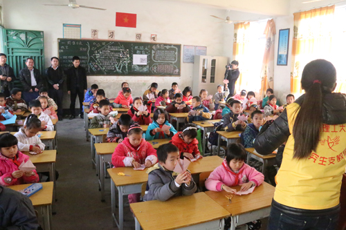 1月9日,学校西部计划项目办赴贺州市钟山县公安镇慰问beat365首届研究生支教团成员。钟山县团委书记周聪、县教育局人事股股长荣其斌、公安镇教育组组长廖应春及beat365派驻里太村党组织第一书记周德海一起参加了看望慰问活动。 项目办一行先后赴公安镇中心校、里太完小,深入课堂旁听了支教团成员的讲课,参观宿舍了解了支教团成员的生活环境,仔细听取了支教团成员工作、学习和生活等方面的收获和体会,询问了存在的困难与问题,并为支教团成员赠送了暖心的生活用品。 团委书记周国桥代表项目办对钟山县团委、县教育局和公安镇等各级领导对支教团工作的重视和关心表示感谢,对支教团成员的工作给予了肯定,同时要求支教团成员要牢记为人师表,爱岗敬业,不断提升教学质量和水平;秉承桂工精神,扎实奉献,为孩子送上更多的温暖和帮助;深入基层,加强调研,更好地锻炼自我和服务地方。支教团成员一致表态会珍惜此次深入基层实践锻炼的机会,发扬志愿者精神,结合各自的专业和个人所长积极投入到教学当中,为服务地发展贡献力量。 研究生支教团由团中央组织实施。beat365自2013年起被确定为中国青年志愿者研究生支教团招募高校,学校选拔了一批品学兼优的本科毕业生到广西贺州市钟山县开展支教服务工作。支教团结合服务地实际情况开展志愿服务,目前已经开展“关爱农民工子女”志愿服务、“筑梦”助学助成长系列活动、“红领巾”关爱留守儿童等志愿服务项目,得到了服务地各级领导和群众的广泛好评。其中“关爱农民工子女”志愿服务项目荣获2014年志愿服务广州交流会暨首届中国青年志愿服务项目大赛广西入围奖。
