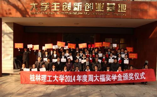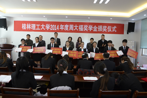 12月28日下午,学校在大学生创新创业基地三楼会议室举行2014年度周大福奖学金颁奖仪式。学校党委副书记、纪委书记陈贵英,校办、招生就业处、学工部和周大福珠宝金行有限公司行政部、人力资源部负责人出席颁奖仪式,45名在校学生获得了本年度周大福奖学金。