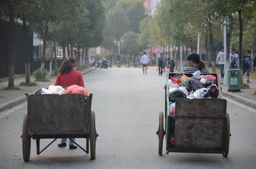 稍微起得早点,在走向教室的路上,便看到她们的身影。有那么几次,看着身材矮小的阿姨拉着巨大的垃圾车,我都想上去帮帮她。