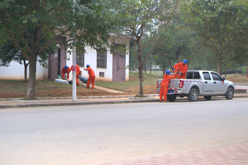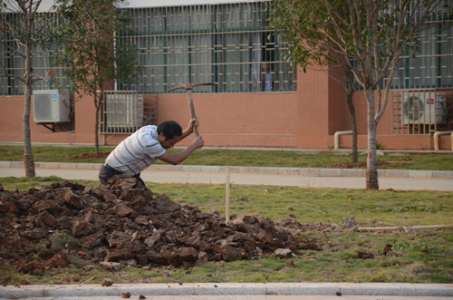 秋风瑟瑟,却单衣T恤,逸夫楼下的绿化带,工人正在进行校园美化工程的工作。整齐美观的绿化带,清新自然的校园环境,正是他们埋头苦干的成果。然而,有多少人感激过他们的付出?