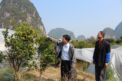 在下山的途中,侯辉老师走入一片果园中,对金桔和蜜桔的生长情况进行了查看。