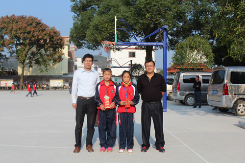 白沙镇第二小学梁校长(右一)、侯辉老师和受资助的两位孩子合影。 |