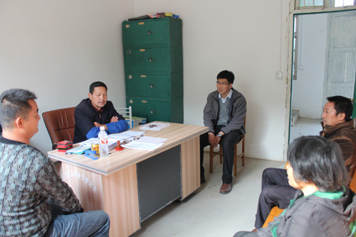 村委办公楼一楼办公室,侯辉老师和村两委干部一起座谈。在听取了村委干部有关近期工作的情况和村内在建项目的施工情况介绍后,侯辉老师以挂点工作组组长和驻村工作队员的双重身份说:“我对新一届的村两委班子就任以来的辛勤工作表示感谢,并对自己近期由于镇里工作安排较多从而进村次数较少表示歉意。近期,村里要将工作重点放在金龙桥至凉亭隘四级公路建设上,这关系着白面山村民的切身利益,希望大家一定要努力克服各种困难,争取在年底之前实现通车。”据悉,作为挂点工作组组长,侯辉老师全程参与了并主持了2014年白面山村的两委换届选举工作。