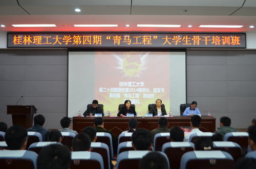 11月19日晚,学校2014年团校暨第四期“青马工程”大学生骨干培训班、2014级班长团支书培训班开班典礼在雁山校区逸夫楼报告厅隆重举行。学校党委副书记、纪委书记陈贵英出席了本次典礼,开班典礼由校团委书记周国桥主持。 开班典礼在激昂的《光荣啊,中国共青团》中开幕,学校团委书记周国桥、副书记白凌婷就“青马工程”培训班和班长、团支书培训班的内容、形式和时间安排作了部署,并提出了学习要求。随后,班长团支书培训班和“青马班”学员代表上台发言,学员们表示一定会珍惜此次学习机会,完善自身知识结构,发挥好大学生骨干模范作用。为丰富培训内容、提高培训质量,培训班还向学员们赠送了《和青年谈马克思主义》和《大学生骨干培训理论读本》等学习书籍。 学校党委副书记陈贵英在开班典礼上讲话,她对学校广大团学干部在学校建设和发展中做出的贡献表示肯定,阐述了新时期开展大学生骨干培养工程的背景、目的和意义,并对培训班和全体学员提出了三点希望:一是要充分认识青年马克思主义者培养工程的重大现实意义和战略意义;二是要珍惜宝贵的学习机会,合理规划,科学安排,圆满完成本次培训班任务;三是要坚持理论联系实际,切实提高履行职责的能力和水平。讲话中,陈副书记还特别强调了大学生骨干要在学风、校风建设中发挥模范带头作用,要在各项活动中发挥组织领导作用,要在联系同学中发挥桥梁纽带作用。 典礼在嘹亮的校歌中落下帷幕,随后,学生工作部(处)部(处)长唐壮东为全体学员作了题为《以服务为荣,以学习为本》的专题报告。