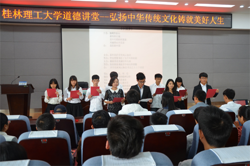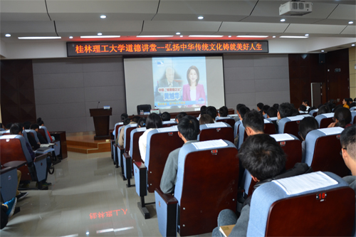 为积极推进学校精神文明建设,大力营造良好的育人氛围。11月18日下午,由党委宣传部、校团委联合开展的道德讲堂活动在雁山校区逸夫楼报告厅举行。桂林市道德宣讲名人,原桂林市委党校向健亨教授应邀为beat365学子作了题为“弘扬中华传统文化,铸就美好人生”的报告。学校第四期青年马克思主义培训班的全体学员以及学生干部代表250余人参加了本次活动。报告会由学校团委白凌婷副书记主持。 唱歌曲,诵经典,学模范,聆听道德故事,接受道德洗礼。全场师生起立聆听轻唱《公民道德歌》,正式拉开了本期道德讲堂的序幕。观看“感动中国2014年度核潜艇之父黄旭华”视频短片,全体师生心中久久不能平静;由广播电台同学现场朗诵的经典诗词《中国梦》,字字句句,引人深思,感人肺腑,把现场氛围拉到了至高点。 随后,在热烈的掌声中向健亨教授开始了幽默生趣的精彩报告。向教授就大学生的人际关系问题,恋爱问题,贫困生问题以及思想道德教育等问题深刻阐述了自己独特的见解。报告中,向教授引经据典,用大量鲜活的生动事例,结合自己人生中的丰富经历,教导学生以积极进取、乐观向上的人生态度,博学精研、勤奋刻苦的求知精神,脚踏实地、实事求是的工作作风,勇敢面对大学生活中的种种人生考验,打造属于自己的精彩人生。最后向教授倡导广大同学要弘扬中华文化,铸就美好人生。精彩的报告赢得了同学们的阵阵掌声。报告结束前,向教授还与在场同学进行了互动交流,畅谈了自己对一些热点问题的看法思考。