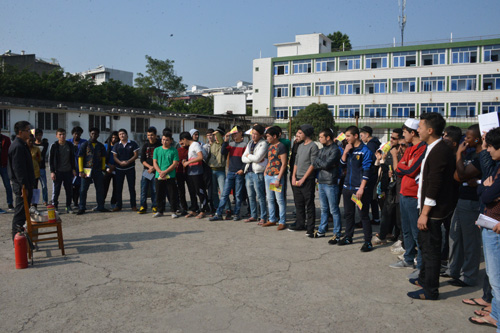 留学生认真听取保卫处有关人员讲解逃生知识与灭火器使用方法