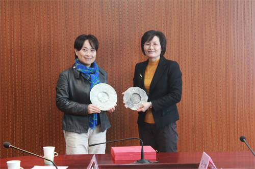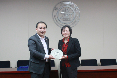 陈贵英副书记(右)与上海交通大学党委副书记朱健交换交流纪念品