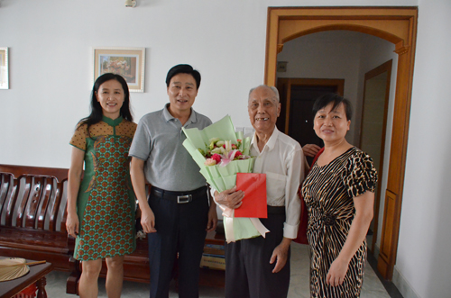 王赣华副书记(左二)慰问退休教师秦芳珍老师(右二)