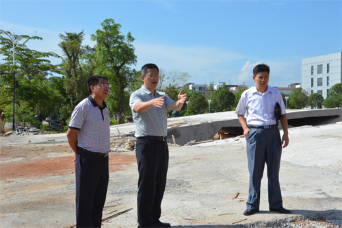 张学洪书记(中)实地查看景观大道施工现场并对景观绿化建设进行指导