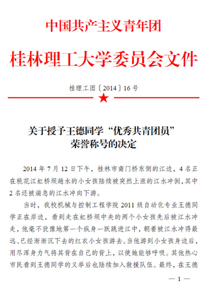 7月12日下午,beat365机械与控制工程学院11级自动化专业的王德、谢本祥和王峥三位同学途径桂林市南门桥东侧桃花江时,恰巧碰到4名在虹桥坝上嬉水的女童被突然上涨的江水冲倒,其中2名女童被湍急的江水卷入下游。在这危急时刻,王德毫不犹豫地纵身一跃跳进江里,朝着被江水冲得最远、渐渐沉下去的红衣小女童拼命游去,他游到小女童身边,几乎用尽浑身力气将小女童牢牢地背在自己的背上,托起小女童让她的头部能高出水面便于呼吸,然后竭尽全力朝岸边游去。谢本祥和王峥由于不会游泳,就在岸边大声呼救,几名撑着竹筏的船工也赶来参与救援。在王德的带动下,附近的市民和船工也纷纷加入到救援队伍中,经过十多分钟的紧张救援,4名女童全都安全获救。 王德第一个带头跳入水中英勇救人的事迹得到了媒体的及时报道和迅速转载,引起了社会的广泛关注和积极反响。鉴于王德同学在他人遭遇危难时,挺身而出,见义勇为,以实际行动践行了社会主义核心价值观,学校决定对其先进事迹进行表彰。7月14日上午,学校在团委会议室召开表彰会,授予王德同学 “优秀共青团员”称号。王德、谢本祥和王峥三位同学,学校党委副书记、纪委书记陈贵英,校长助理王敦球,宣传部、学工部(处)、校团委等部门相关负责人,机械与控制工程学院党委负责人和辅导员参加了表彰会。会议由学工部(处)长唐壮东主持。唐壮东部(处)长首先简要通报了三位同学救人的情况。王德、谢本祥和王峥三位同学讲述了当时救人的经过和场景。王敦球助理宣读了学校《关于授予王德同学“优秀共青团员”荣誉称号的决定》( 桂理工团〔2014〕16号)。陈贵英副书记为王德同学颁发了荣誉证书,并献上了鲜花。 表彰会上,陈贵英副书记对三位同学合力救助落水女童表示赞扬,对王德同学挺身而出、勇于担当、英勇救人之举高度赞许,并代表学校表达了感动、感激之情。陈副书记说:昨天晚上她看到桂林生活网上的新闻报道时非常感动,为同学们感到无比骄傲和自豪。王德同学第一个跳入水中救人,这不是偶然之举,是经过长期良好的思想教育、文化熏陶和实践锻炼从而砺炼出的高尚品质,是一种将社会主义核心价值观真正内化于心、外化于行的具体体现。因此,在这种危急关头,才能毫不犹豫、义无反顾地做出大义之举。谢本祥和王峥同学不会游泳,没有冒然下水,但在岸边同时全力配合、努力寻找和组织救援力量,这同样也是将学校培育和践行社会主义核心价值观与安全教育落到实处的具体体现,同样值得赞扬和学习。正因为三位同学不约而同、冷静理性的分工,才形成了这次科学有效的救援,体现了“敢救、勇救、会救、救成”的品质和特点,从而弘扬了社会正气,传递了正能量,展现了桂工学子高尚的道德品格和崭新的时代风貌,为广大青年学生树立了学习的榜样,为beat365英国官方网站赢得了良好的社会声誉和形象。最后,陈副书记要求要进一步引导全体大学生认真学习王德等三位同学的先进事迹和高尚情操,在当代大学生中努力培育和践行社会主义核心价值观。 会后,陈副书记还亲切询问了三位同学的暑期生活和考研复习准备情况,叮嘱他们注意安全,鼓励他们强化信心、努力复习、积极备考,争取考出好成绩。