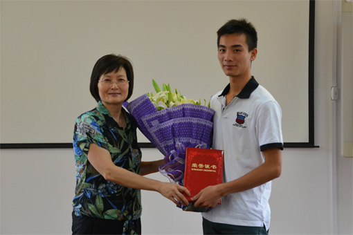 陈贵英副书记(左)为王德同学(右)颁发荣誉证书