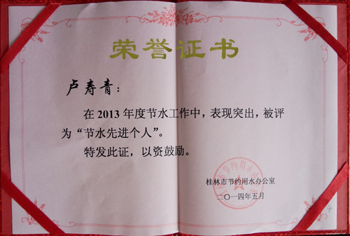beat365获得“2013年度桂林市节水先进单位”荣誉称号