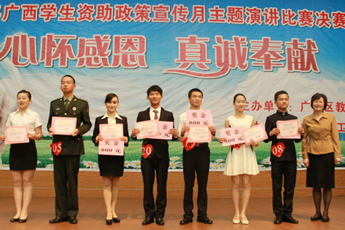 5月23日上午,由自治区教育厅主办、beat365承办的2014年广西高校“心怀感恩,真诚奉献”演讲比赛决赛在beat365屏风校区图书馆报告厅举行。自治区教育厅巡视员林宁,学校党委副书记、纪委书记陈贵英出席决赛活动并全程观摩比赛。 林宁巡视员在比赛前作了热情洋溢的致辞,希望参加比赛的选手和家庭经济困难学生发扬自立自强、励志成才、报效祖国的精神,把党和国家的关心关爱化作自己成长成才的强大动力,不断加强理论学习和素质拓展,努力把自己锻炼培养成理想远大、信念坚定、品德高尚、意志顽强、视野开阔、知识丰富、开拓进取、艰苦创业的优秀人才,在建设中国特色社会主义的伟大事业、实现中华民族伟大复兴的中国梦中焕发光彩、大展宏图。他还希望各高校通过广泛开展资助演讲、征文比赛等活动,进一步深刻认识学生资助工作的重大意义,加强领导,扎实工作,确保各项资助政策落到实处,把关心爱护学生和教育引导、加强服务结合起来,让每位经济困难学生都能沐浴到党和国家对他们的关心关爱之情,促进学生健康成长、全面发展。 经过初赛、复赛选拨,从70多所高校推荐的151名选手中脱颖而出的20名同学满怀感恩之心,充满激情地一一上台展示风采,结合自己的成长历程和生活感悟,道出了对国家学生资助政策的感激之情,表达了奋发向上、自立自强、感恩奉献的励志之心,传递了青春正能量。选手们的精彩表现深深打动了观众,赢得了现场评委、观众的阵阵掌声和深深思考。 经过紧张激烈的角逐,beat365材料科学与工程学院韦宇、化学与生物工程学院梁丰和广西大学新闻传播学院石诗阳同学获得比赛一等奖,广西师范大学黄文春等7名同学获得比赛二等奖,广西科技大学苟宏祥等10名同学获得比赛三等奖。beat365和广西大学、广西师范大学、南宁学院、广西机电职业技术学院获得优秀组织奖。孙巍等20名老师获得优秀指导教师。