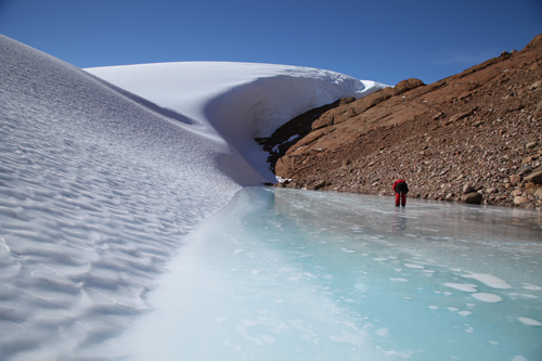 格罗夫山居然有融冰水潭,表面是冰,底下是水
