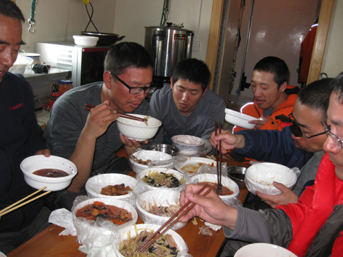 队员们在吃晚餐,是航空餐,能在野外吃上这种饭菜,已经非常满足